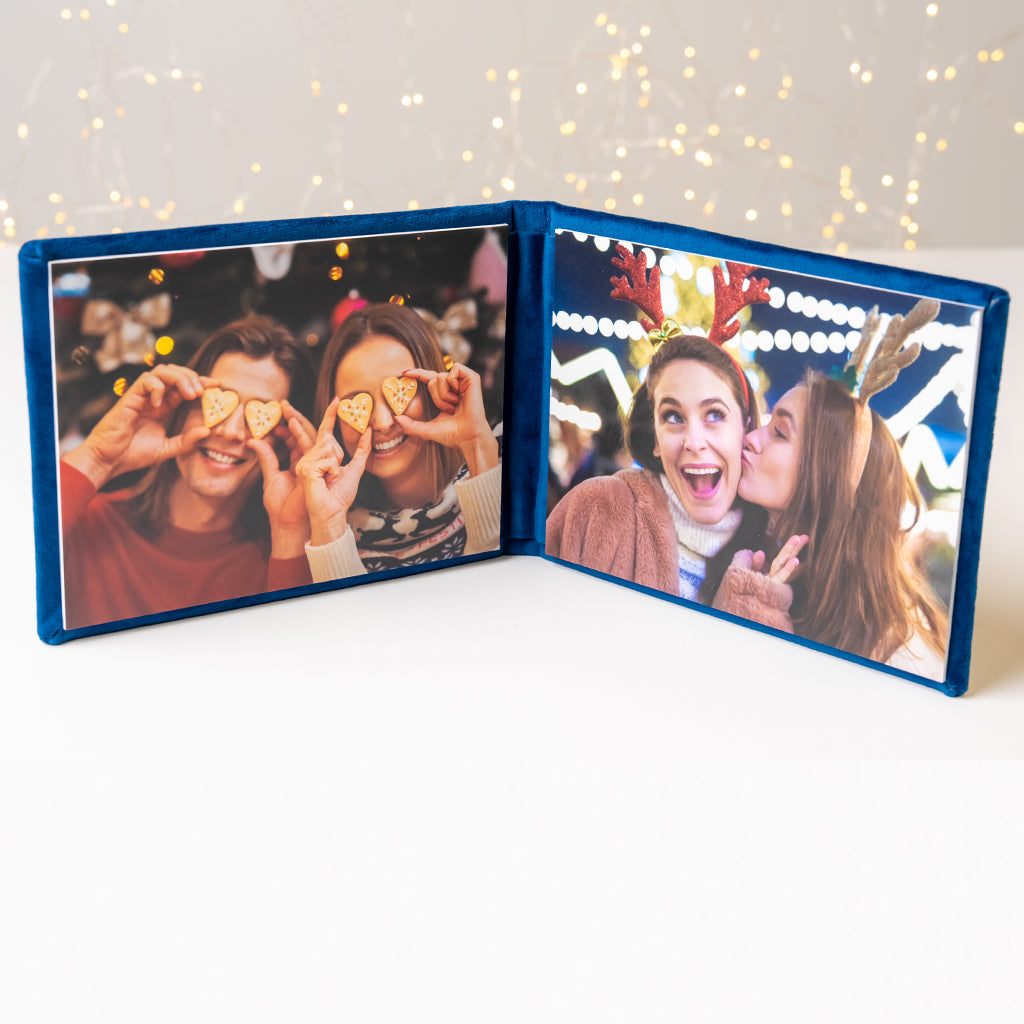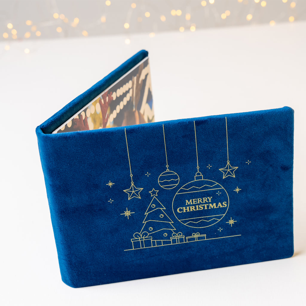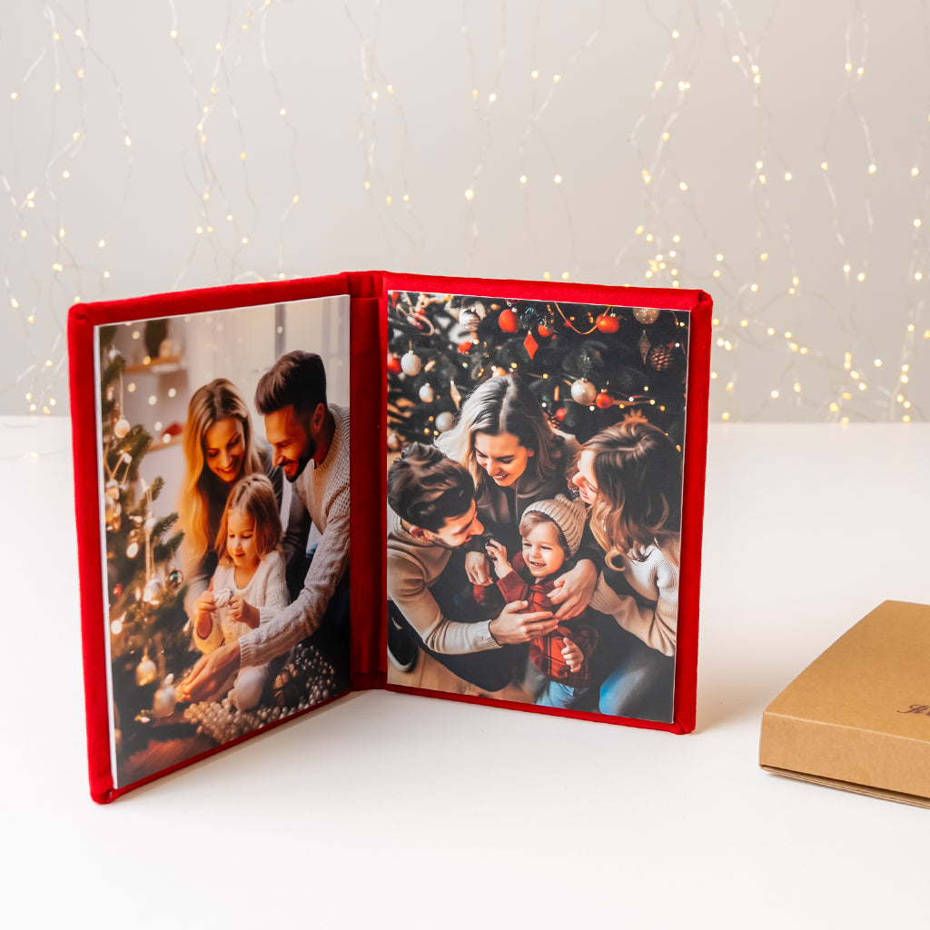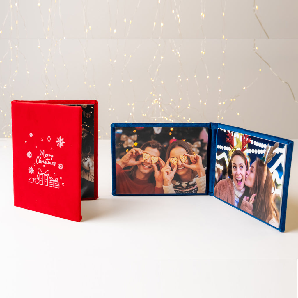 Realizzata per accogliere due fotografie stampate su pannello 15x20 cm in forex con stampa UV, questa cornice è rivestita in morbido velluto nei classici colori del Natale (rosso, verde, dorato).